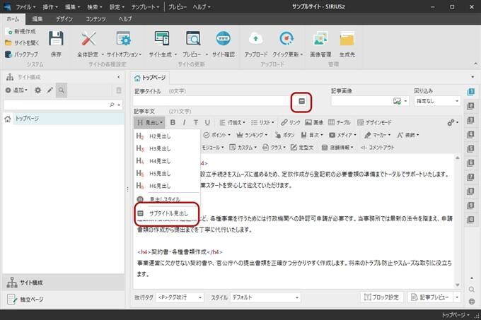 SIRIUS2 Ver1.230から、通常の見出しにサブタイトルを付ける「サブタイトル見出し機能」を搭載しています。