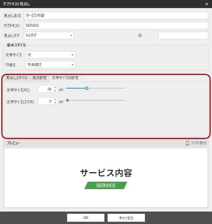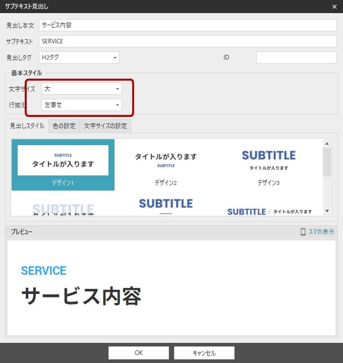 次に見出しの文字サイズと、行揃え(配置)を指定します。